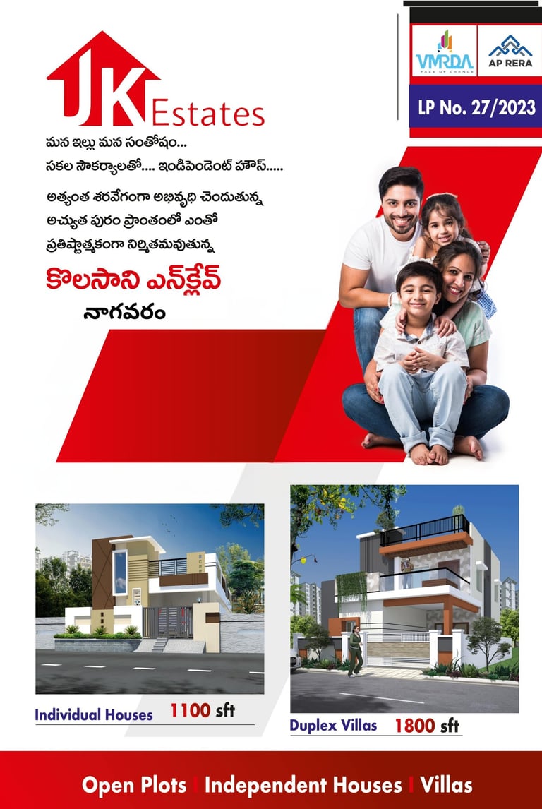 JK Estates proudly brings Kolasani Enclave near Nagavaram, a fast-developing corridor of Visakhapatnam. This is not just a layout, it is a complete venture with ready-to-build, vastu-compliant individual houses. Every design keeps in mind the lifestyle of Vizag families: open spaces, comfort, and long-term value. Kolasani Enclave is set to become a landmark where customers don’t just buy a house, they secure a future.